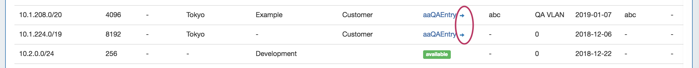 If a block is subassignable, a blue arrow will display in the "Assigned To" field in IPAM Manage.