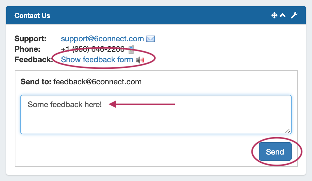 From the dashboard "Contact Us" Widget, you may click the support link to email a support request to support@6connect.com, or click "show feedback form" to open a form to send a short feedback message to feedback@6connect.com.