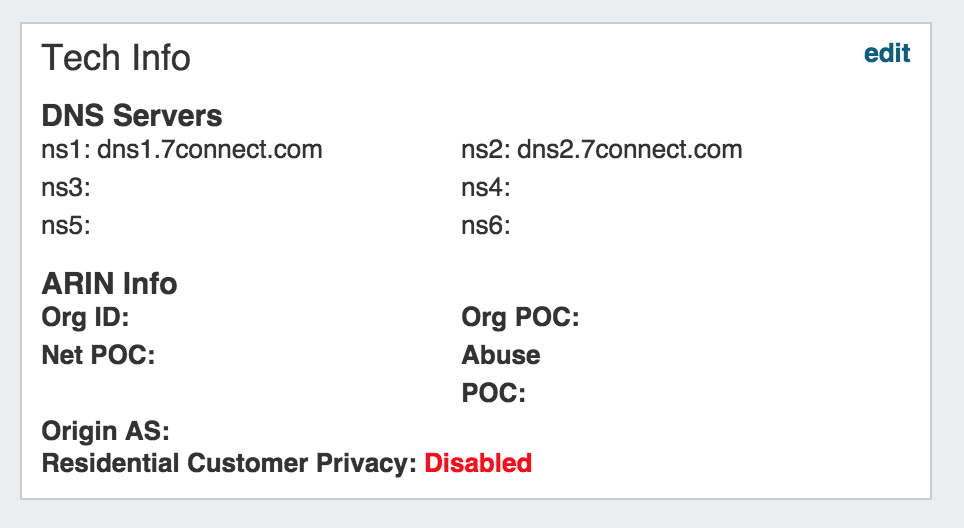 This visual element is used on the Resource Holder Section type. This Gadget allows you to list DNS servers, ARIN information, and enable/disable customer privacy.