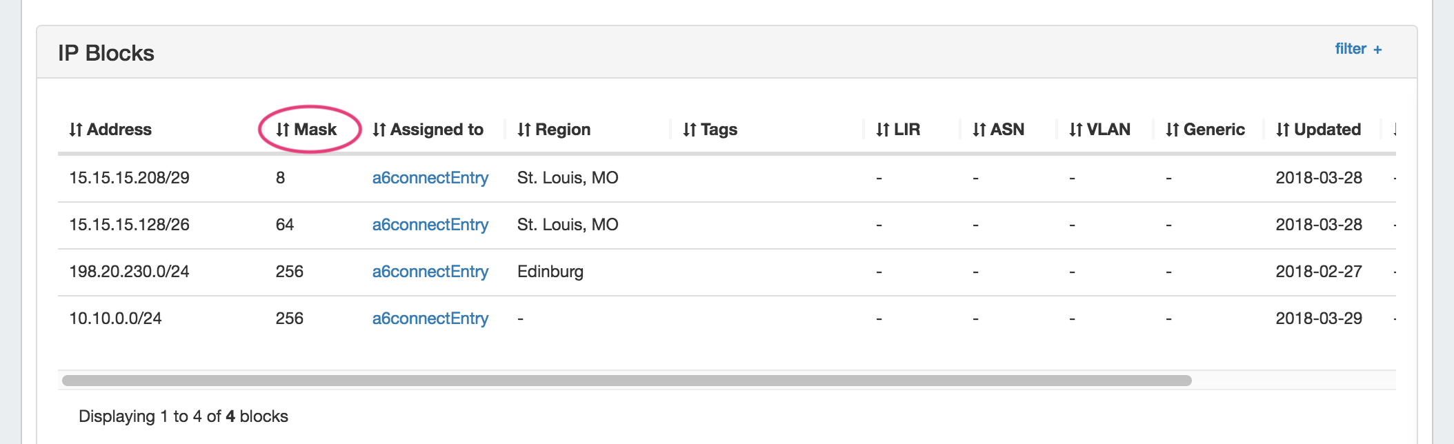 View, Filter, and Sort Assigned Blocks for the resource via the "IP Blocks" list.