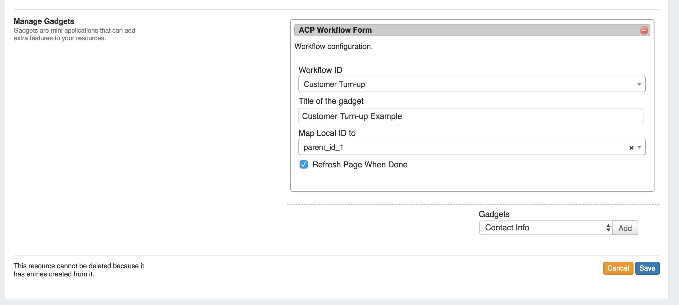Customers with an ACP license can select and add the "ACP Workflow Form" Gadget to a Section, containing fields to select the desired Workflow to Run, Title, and map input options. Multiple Forms may be added to a Section, in order to run additional Workflows or option settings. When complete, click "Save".
