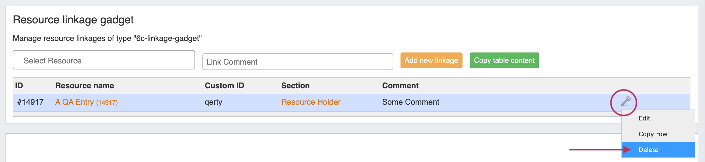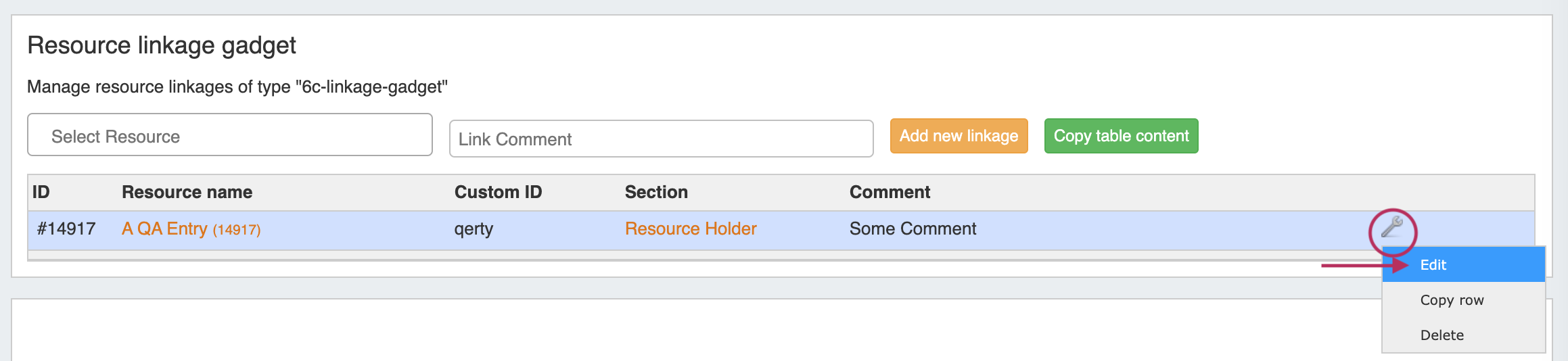 To use the Resource Linkage Gadget, first, ensure that "Resource Linkage" is enabled under "Manage Gadgets" for the Section type of the Resource being used.