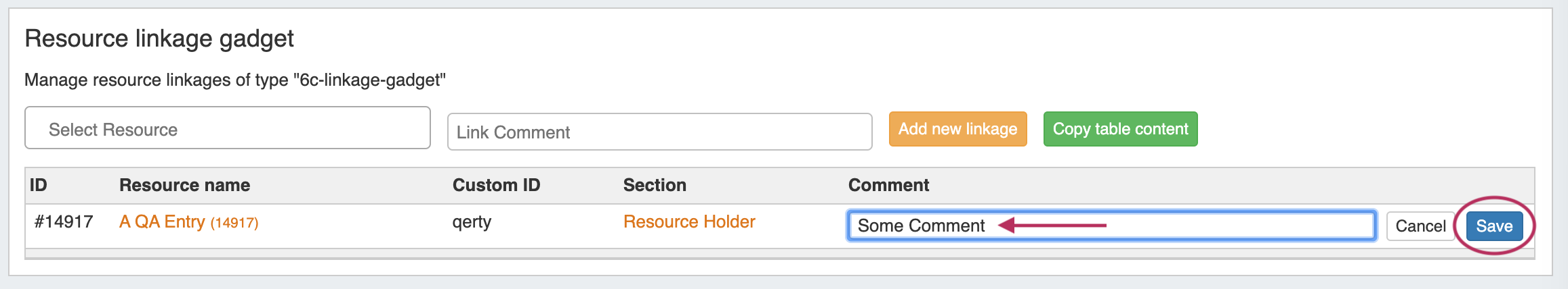 Search for the desired Resource to add, select, type in a note, and click "Add new linkage". A reciprocal link will be created, and the linked Resource will show in the Resource list for the gadget.