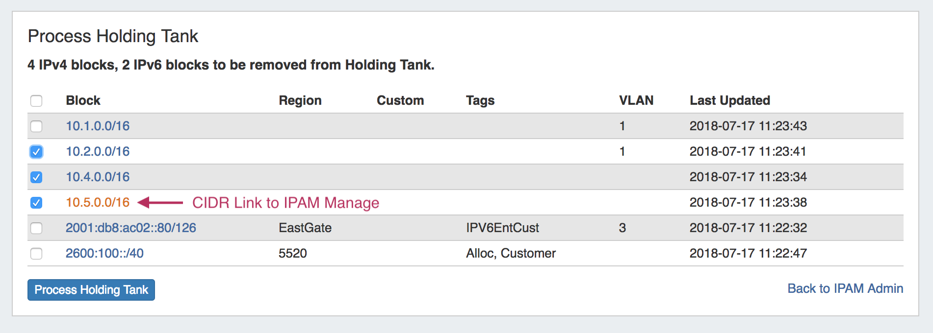 While in the Holding Tank, you may open the IPAM Manage page for a specific block by clicking on the block's CIDR - this allows you to review the block or manually manage it otherwise.