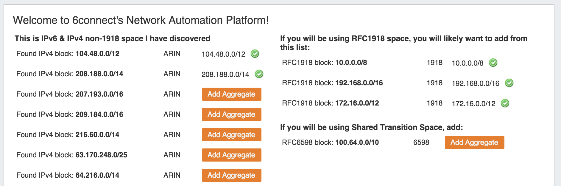 This page allows you to add both 1918 aggregates as well as public IP space from ARIN and RIPE.