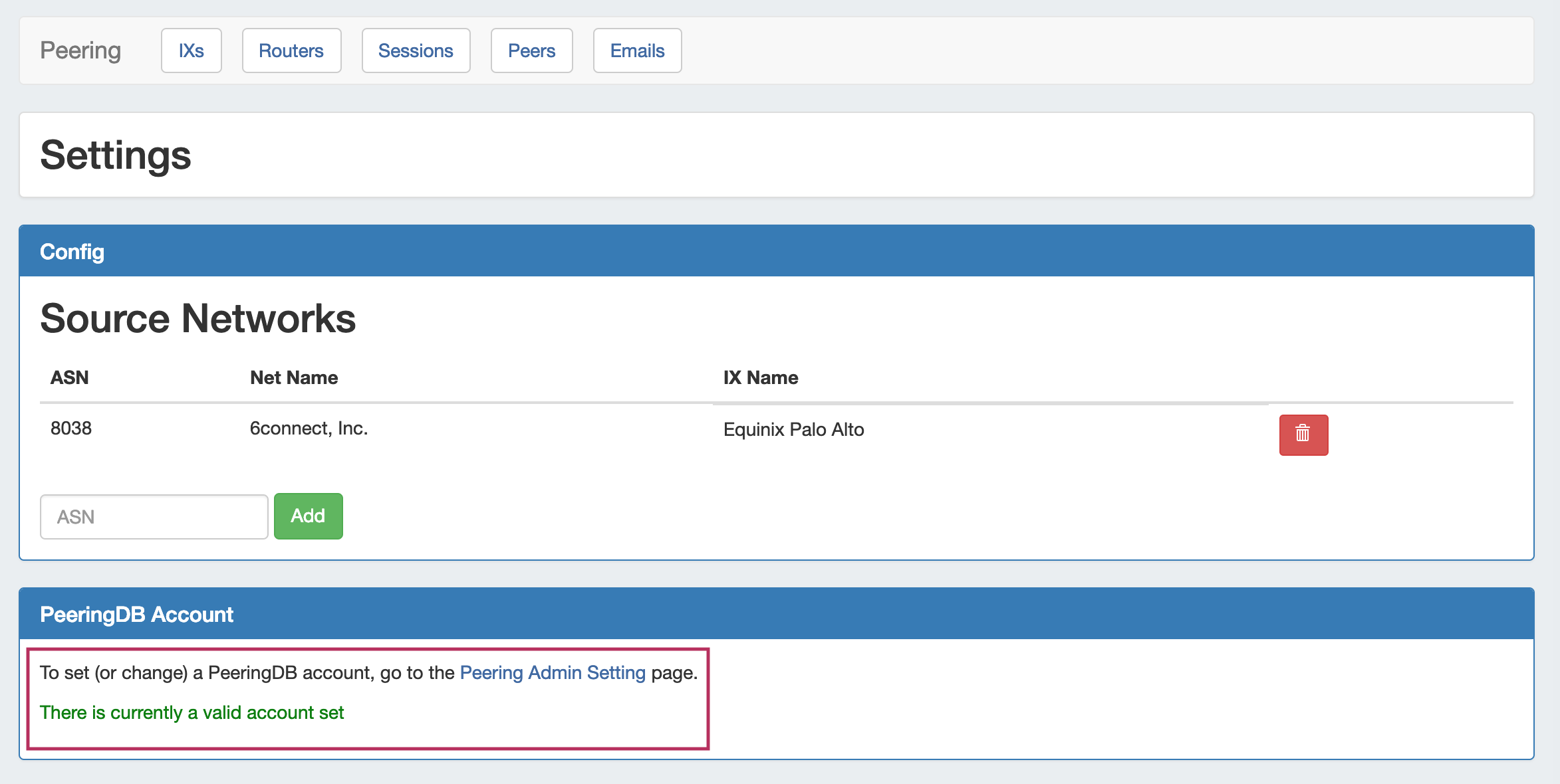 After the initial Peering setup is complete (Adding ASNs and a Peering DB account), you can begin to work with the rest of the Peering tabs, including routers, peer groups, sessions, managing peers, and communications.