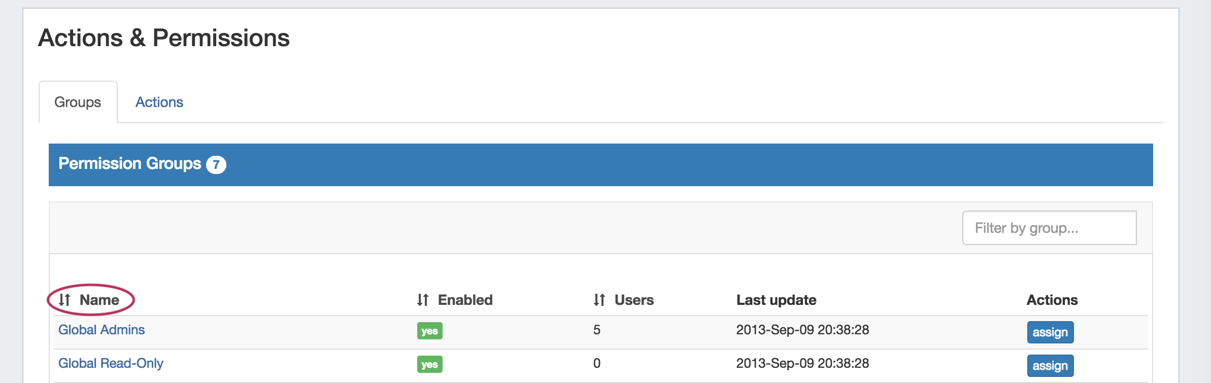 Sort the Permission Groups list by Name, Enabled, or Users by clicking on the column name.