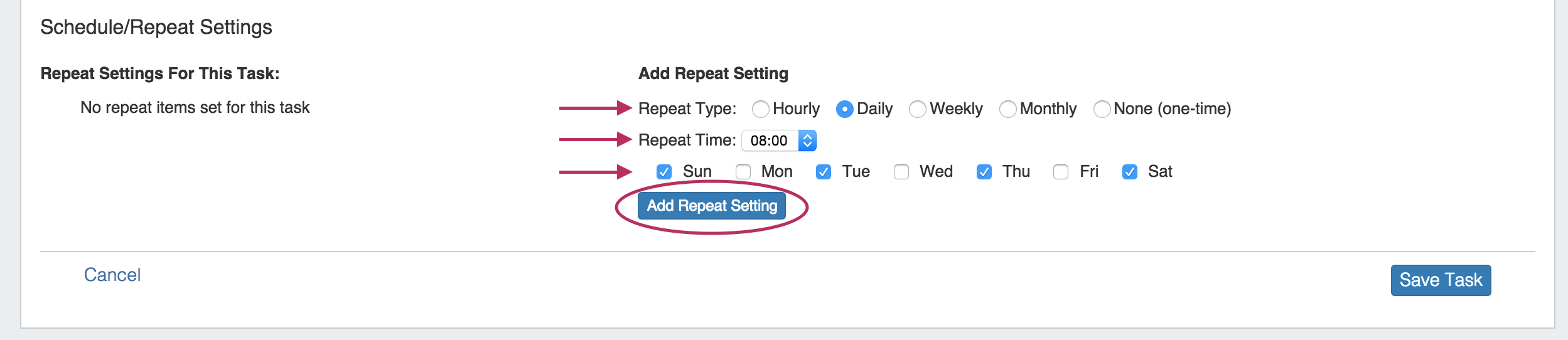 Add repeat settings for your tasks. First, select your repeat type - hourly, daily, weekly, monthly, or none (one time). The type that you select will prompt different additional setting options.