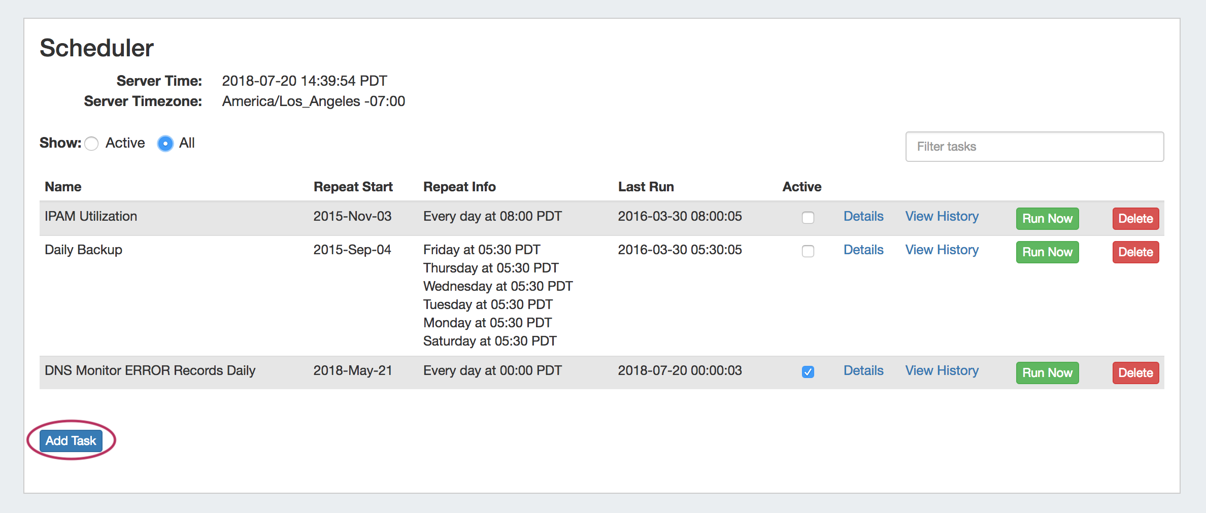 After tasks have been added, they will show in the task list along with their basic settings. The list may be filtered to show all tasks or active tasks only by selecting the radio buttons next to "Show:". Further filtering may be done by typing a Name or Repeat Info keyword into the "Filter Tasks" input box above the task list.