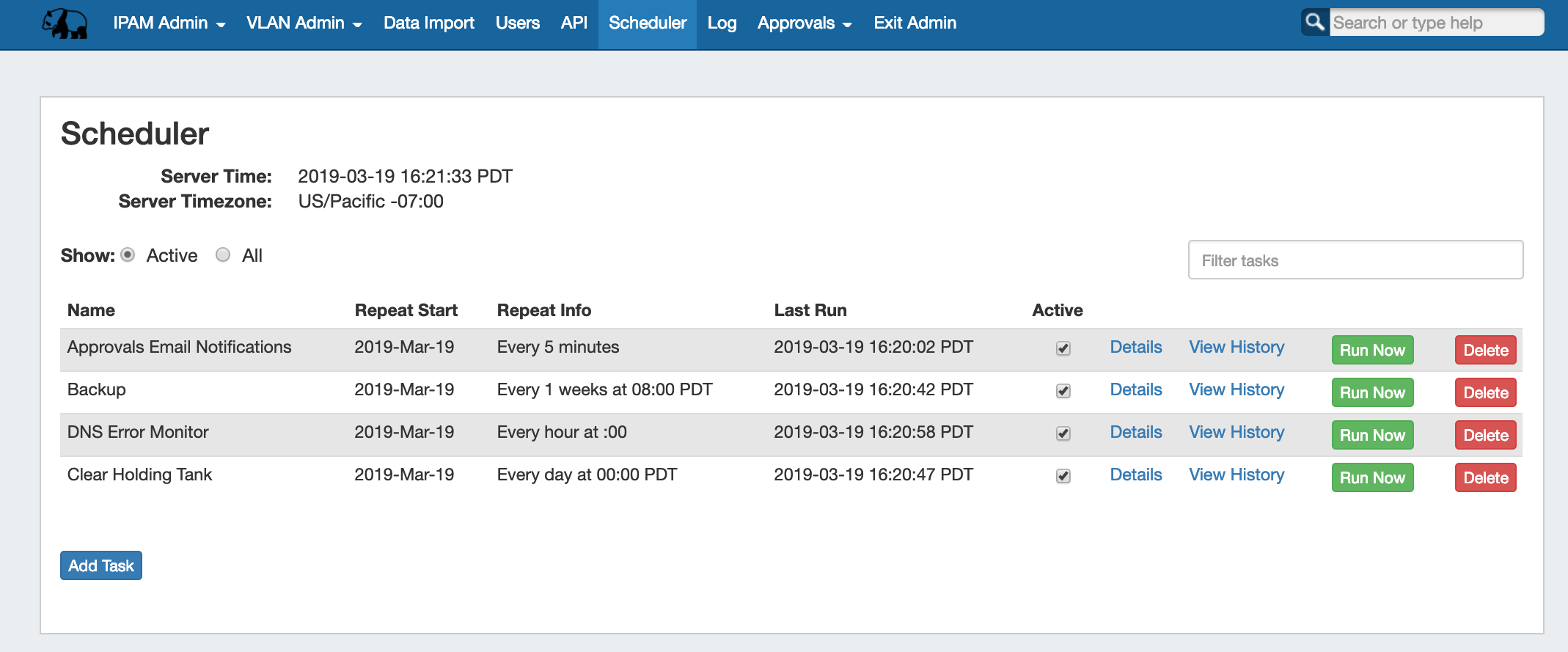 From the task list itself, you can enable/disable tasks, view details, view history, run tasks, and delete tasks.