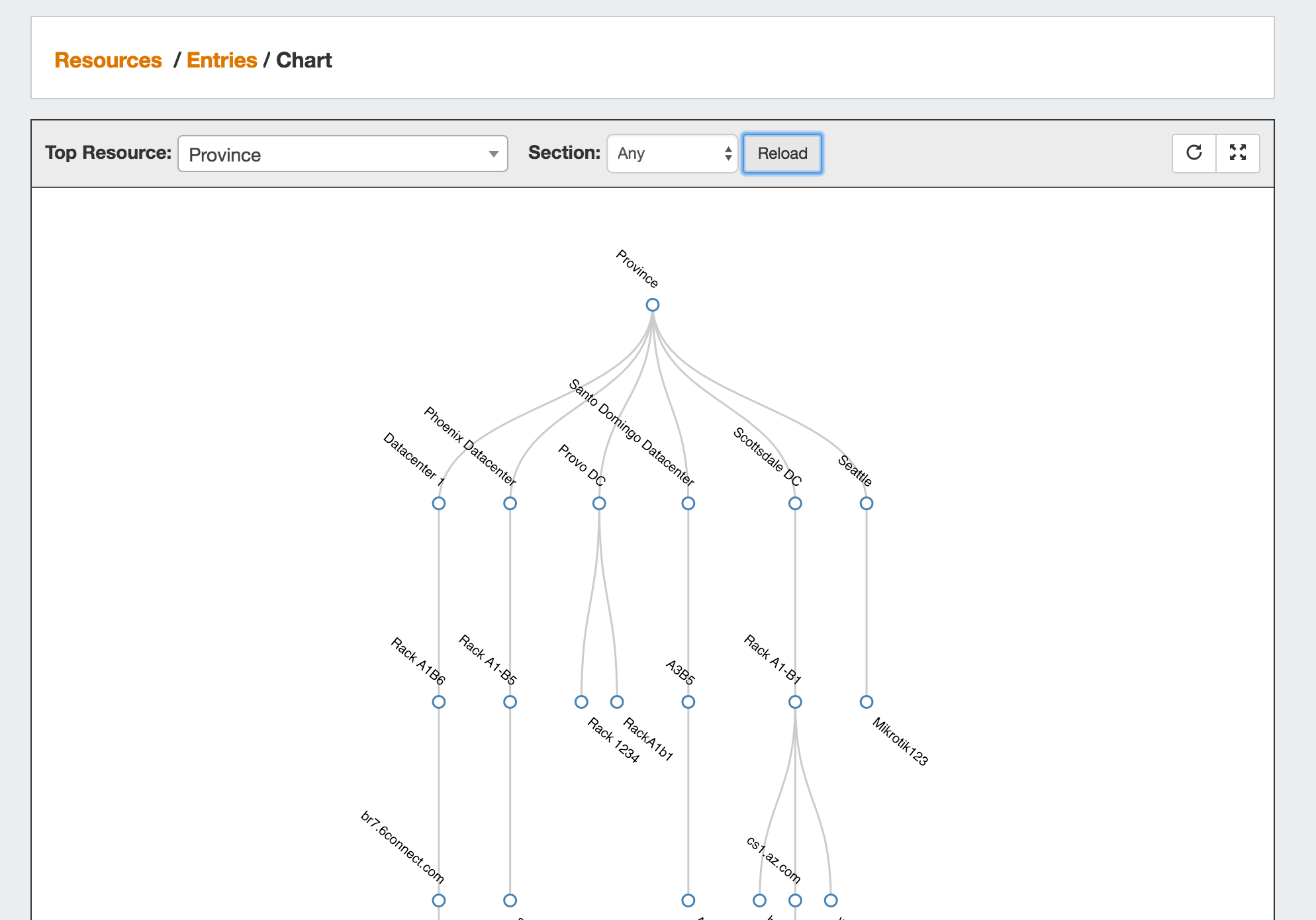 In ProVision, "Child" Resources can be created underneath a "Parent" resource. This functionality allows for hierarchies to be created to match the desired organizational structure. An example of this would be to create racks and servers as children under a datacenter entry. Chart View, available from the Resources Tab, lets you see this structure graphically.