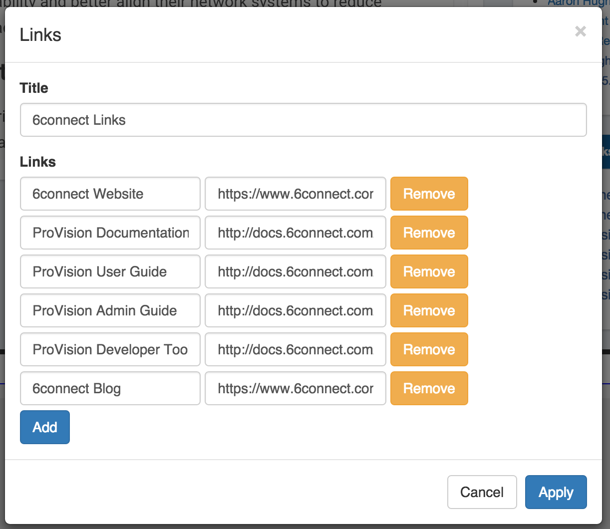 Links: Enter the desired link text, then the URL of the website to link. Click "Add" to add a new link, or "Remove" to remove an individual link. Hit "Apply" to save your changes.