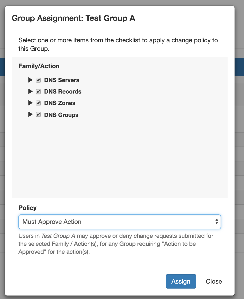 Further fine-tuning of the action types for permissions is done by selecting the combination of "Family" (type of DNS item) with the Action Type. DNS Families include DNS Servers, DNS Groups, DNS Zones, and DNS Records. Each type of action can be performed on each family, so when setting up Approval Permission Groups you may choose to set the policy for the entire Family (ex:"All DNS Group actions"), Action (ex:"Add actions for all DNS Families"), or just a specific combination (ex: "Only DNS group Delete").