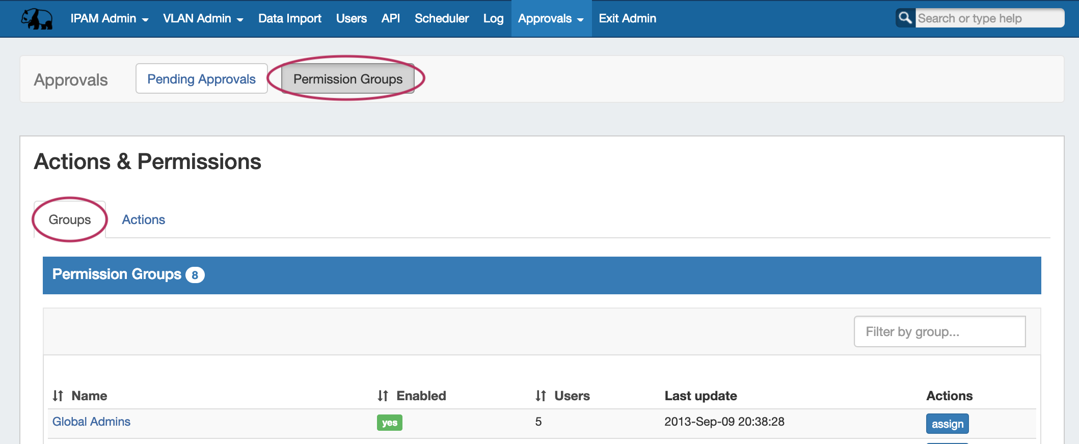 From the Approvals Tab, navigate to the Permission Groups sub-tab Groups page tab: