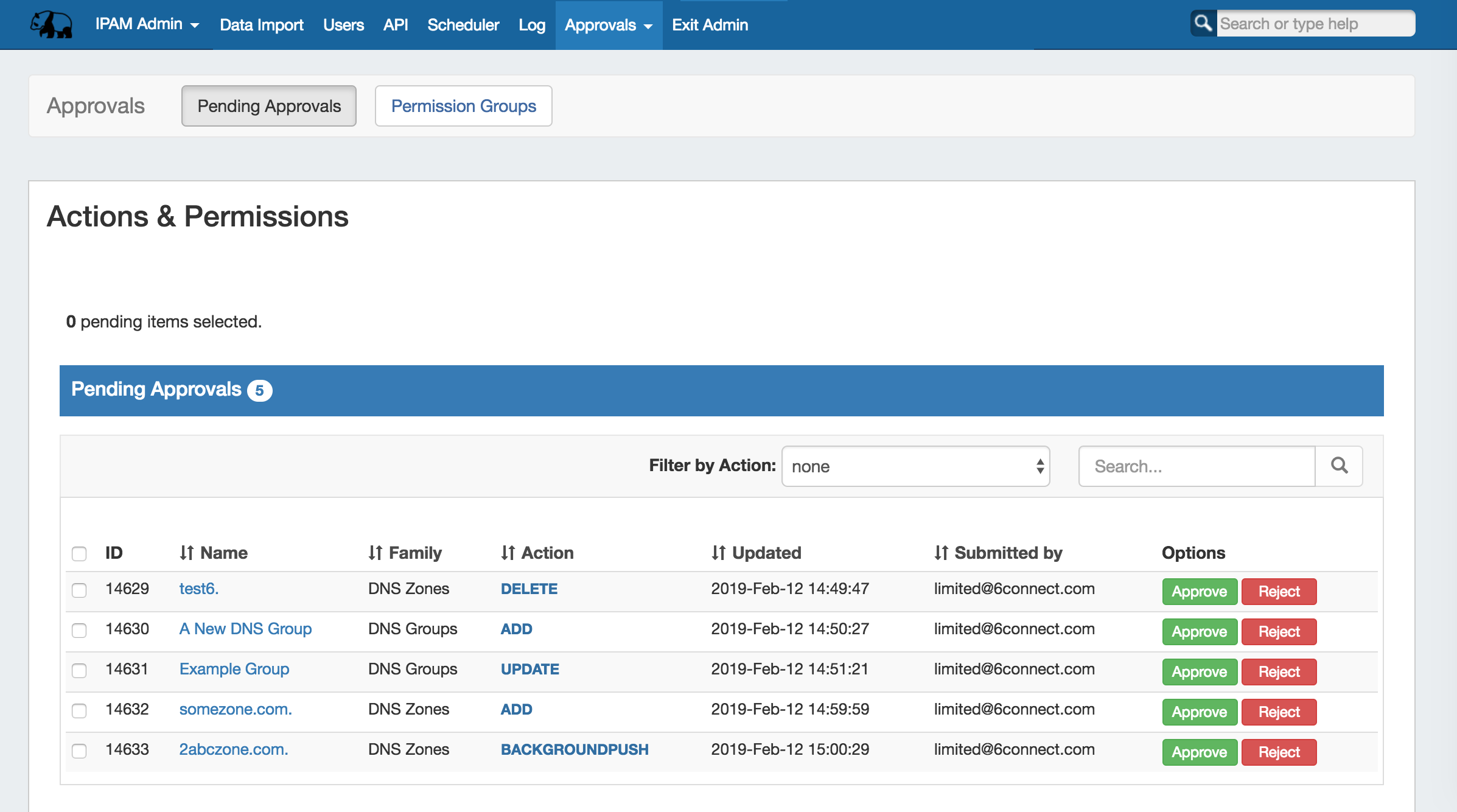 With Approvals, administrators can set group permission rules requiring that certain types of DNS changes made by a user are either 1) automatically denied or 2) approved by an administrator. In the latter case, one or more admin group(s) must be assigned to approve those action types.