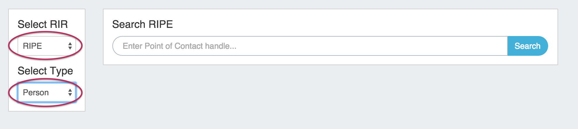 After selecting the RIR / Type (if applicable), enter the ARIN or RIPE Point of Contact Handle for the contact you are importing, then click "Search".