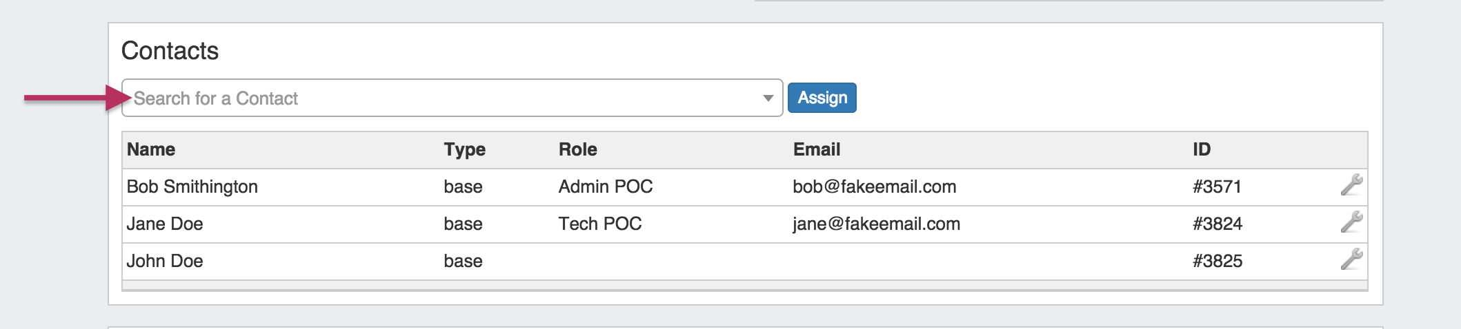 Once a contact has been assigned, you can create and set a role for the contact by clicking on the Action Menu (wrench icon).
