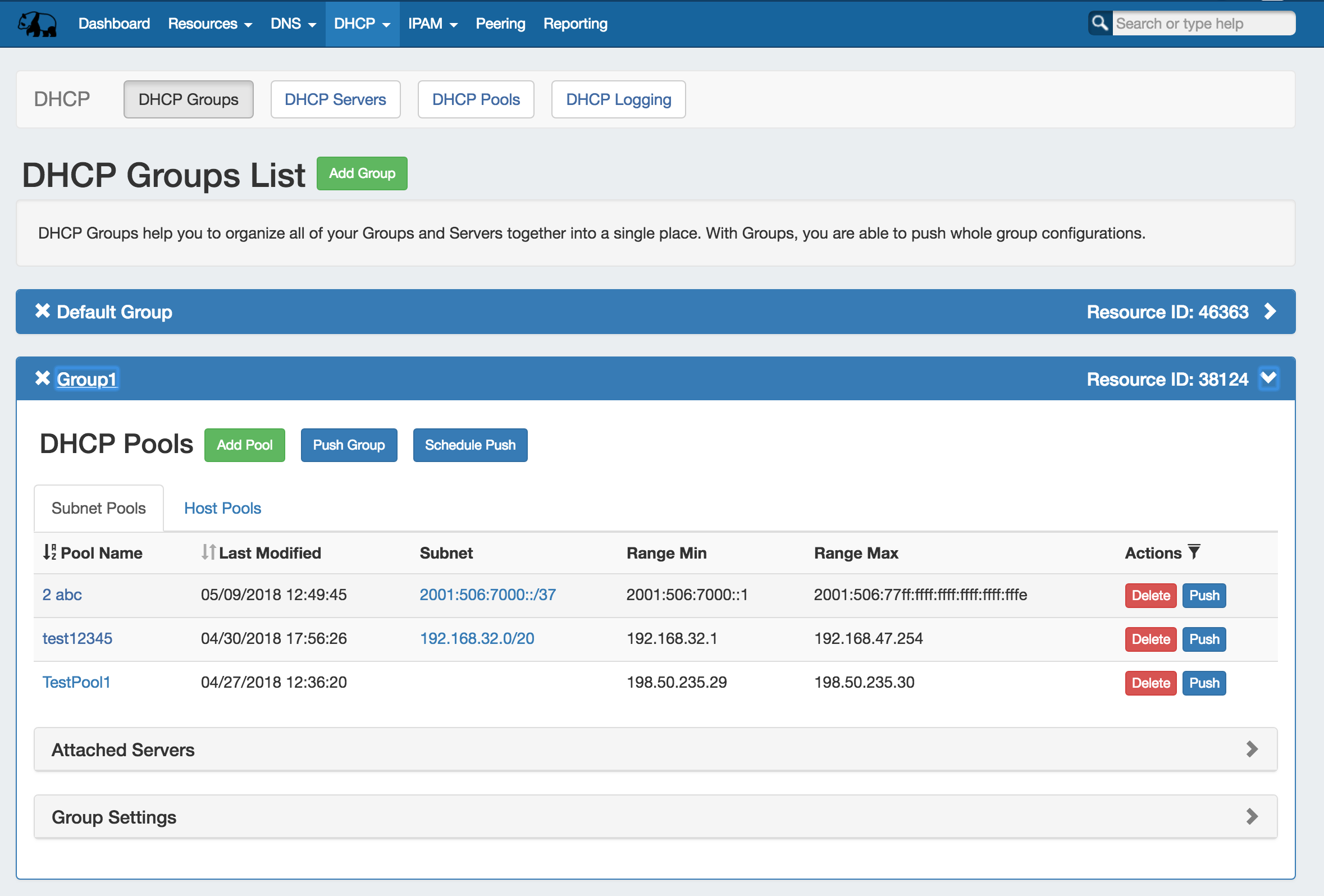 The DHCP Groups tab is where DHCP servers and pools are managed as a part of DHCP Groups. The DHCP tab DHCP Groups List allows you to create, view, and manage groups of DHCP servers and pools. Using groups, you can configure and push selected combinations of pools at one time.