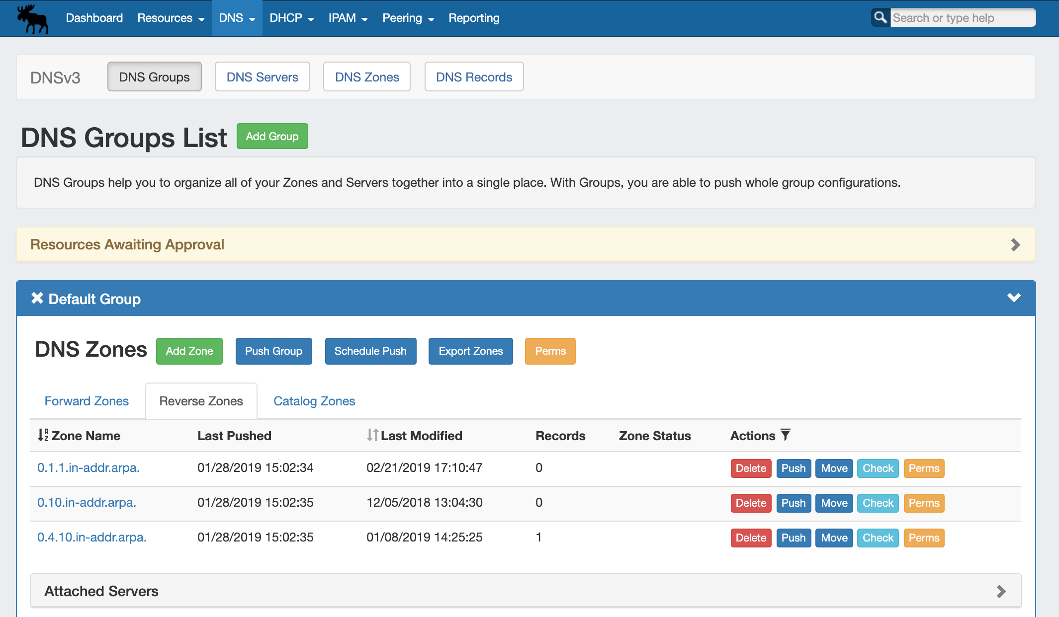 In the DNS Tab, a "Resources Awaiting Approval" module will display near the top of DNS Groups, DNS Zone Lists, and DNS Servers pages, if a change has been submitted on that page that is pending approval.