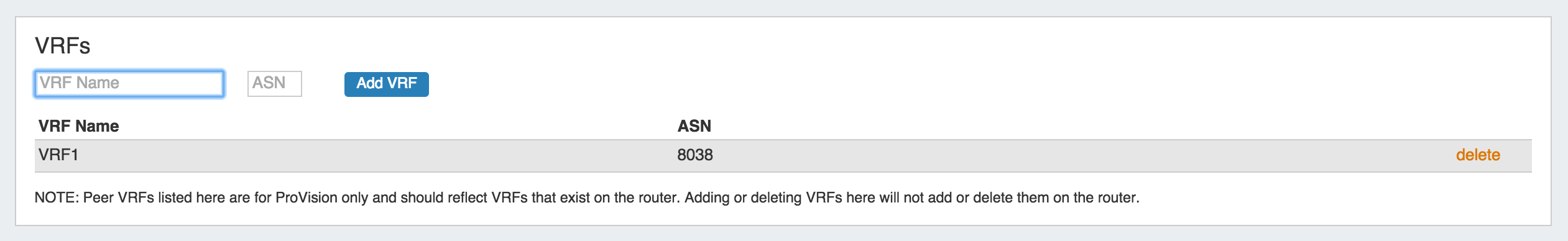 To add a VRF, type the VRF name and ASN, then hit "Add VRF".