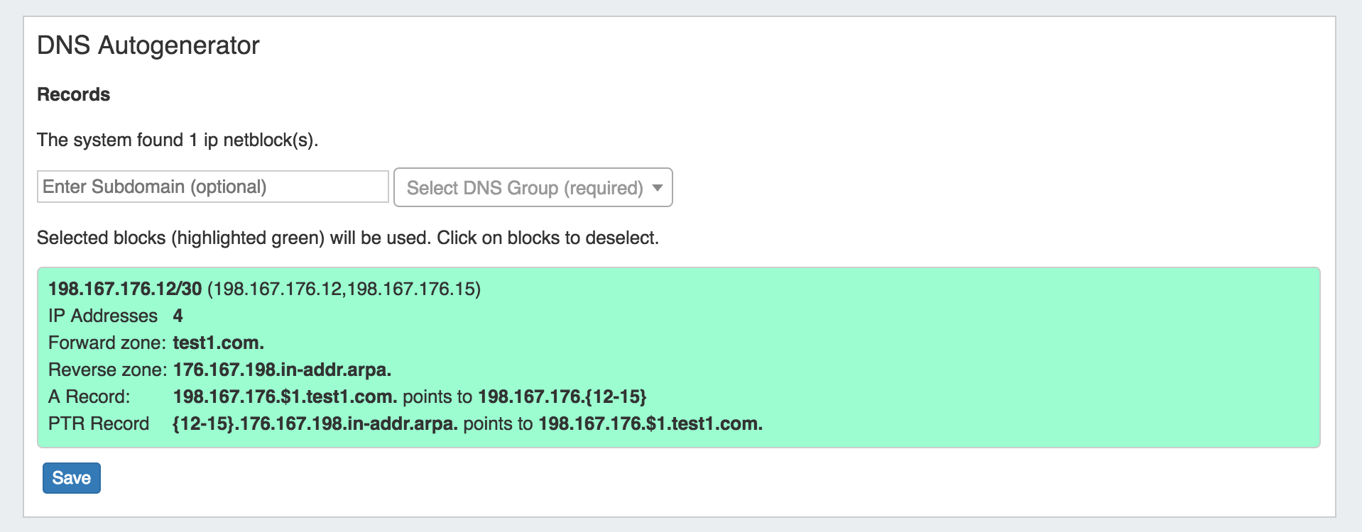 Finally, hit the "Save" button at the bottom of the gadget - the selected forward and reverse DNS records will be created and added into the DNS Group, viewable in the  DNS Tab.
