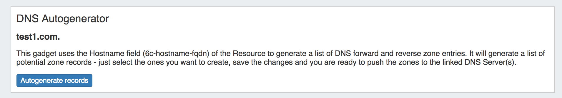 The DNS Autogenerator Gadget uses the Hostname field (6c-hostname-fqdn) of the Resource to generate a list of DNS forward and reverse zone entries based on the blocks assigned to the Resource in the IPAM Gadget It will generate a list of potential zone records - just select the ones you want to create, save the changes and you are ready to push the zones.