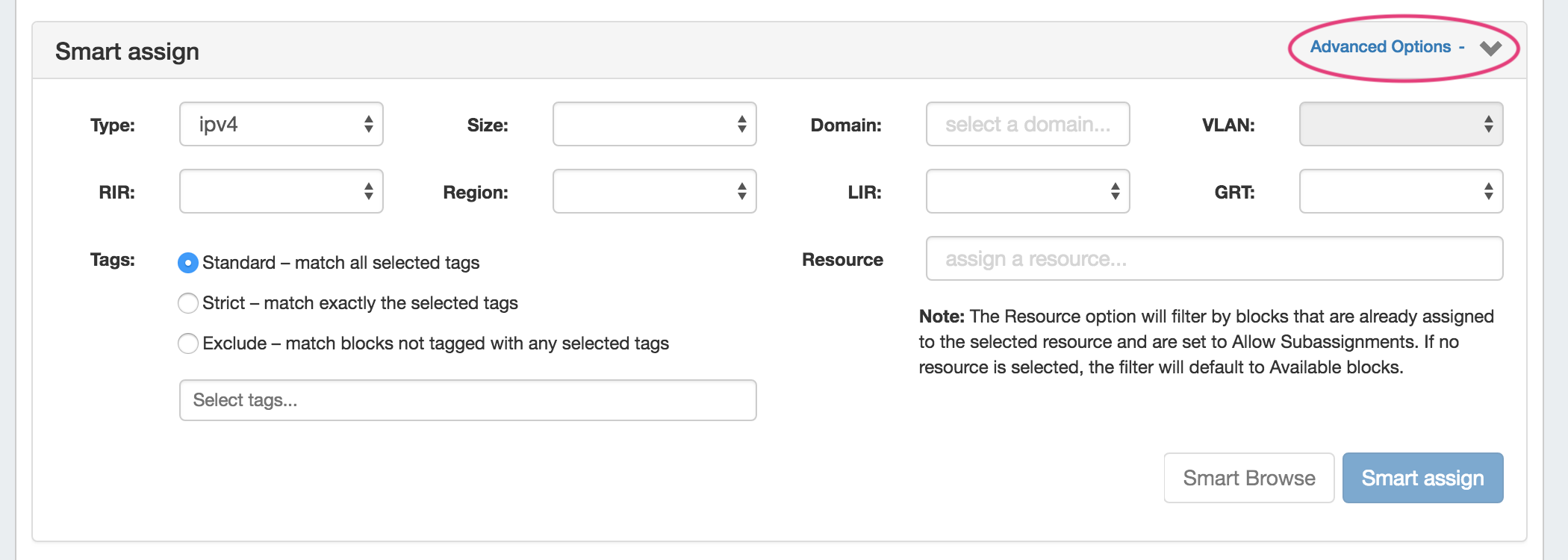 • Smart Assign with or without additional filtering options. Required fields for Smart assign are: "Type", "RIR", and "Size", but additional fields such as "Region", "VLAN", "LIR", "Resource" (for blocks that allow subassignments), and various "Tag" mode options.