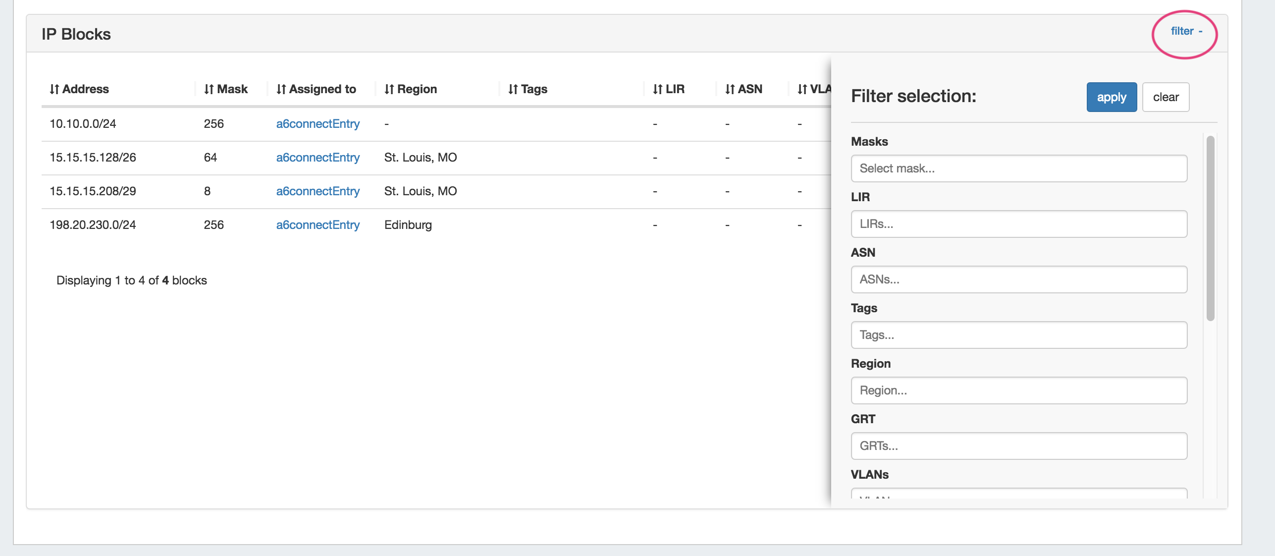 For more information on assigning and managing blocks, see Working with IP Blocks - Assigning IP Space.