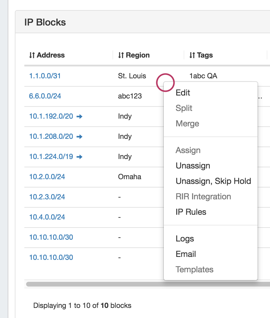• Manage Assigned Blocks for the resource by going into the "IP Blocks" list, and using the Action Menu (Gear Icon) to perform actions for the selected block.