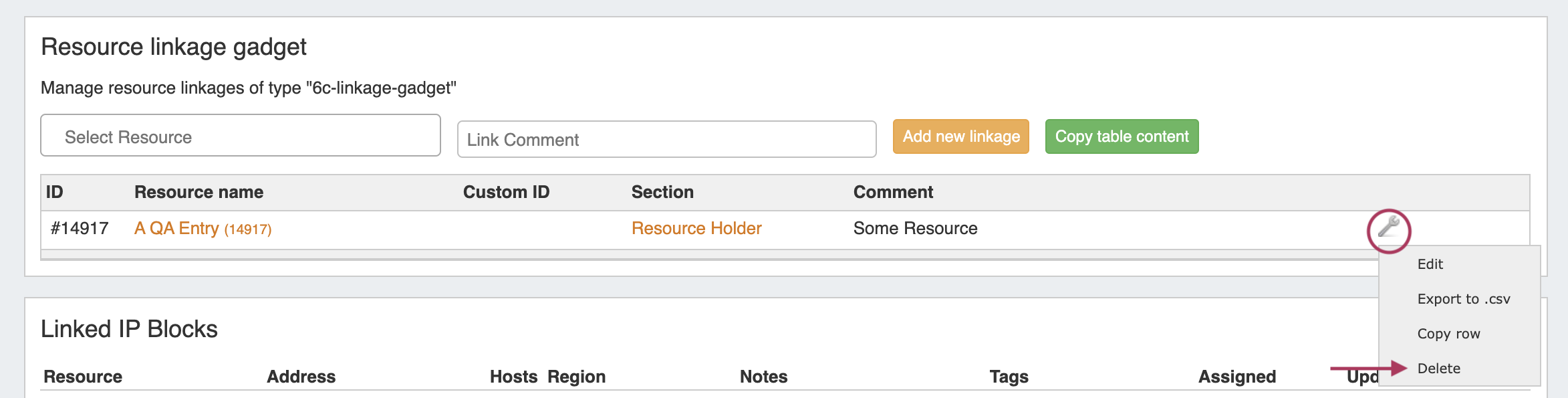The Linked IPs Gadget lists IP blocks assigned to Resources linked under the Resource Linkage Gadget, with a link to the resource holder.