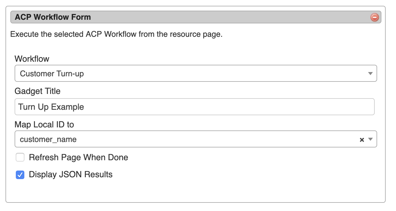 Once ACP settings have been added to Admin Preferences, the "ACP Workflow Form" Gadget can be added to a Section, and Workflows from the associated ACP instance will be available to select. containing fields to select the desired Workflow to Run, Title, and map input options.