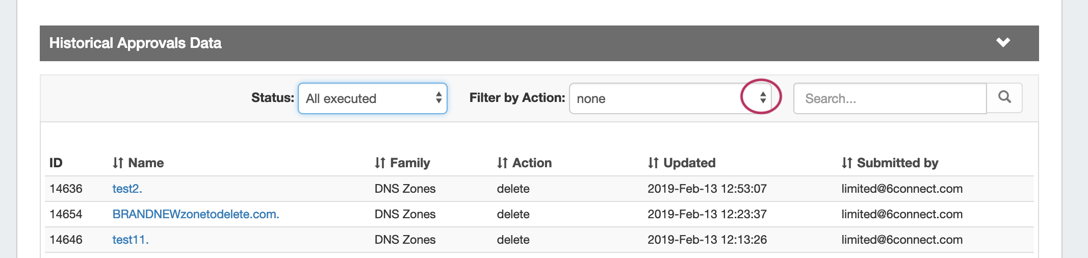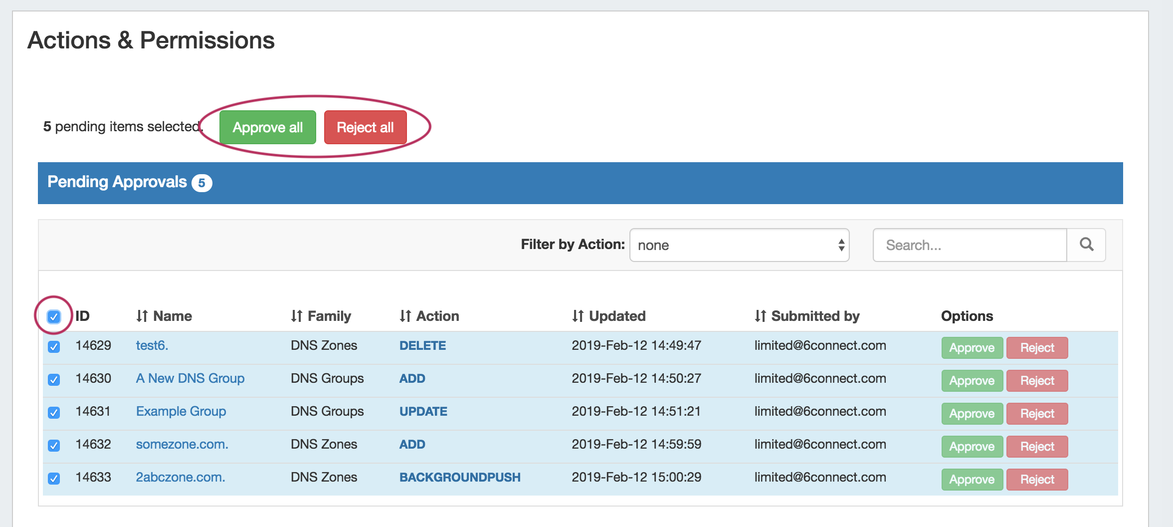 Currently, Approvals is available only for DNS related actions, while we gather feedback and use cases to inform possible future updates. If you are interested in providing feedback, a use case, or requests for future additions to the Approvals system, please contact feedback@6connect.com.