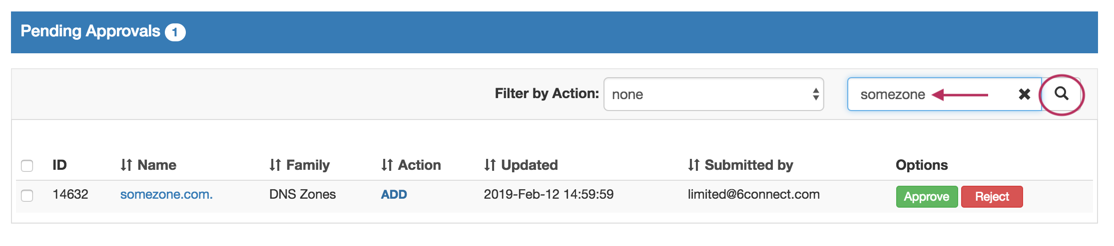 Approving or Rejecting a request may be done from the Pending Approvals list, the detail view for the item, or from the DNS "Resources awaiting approval" module.