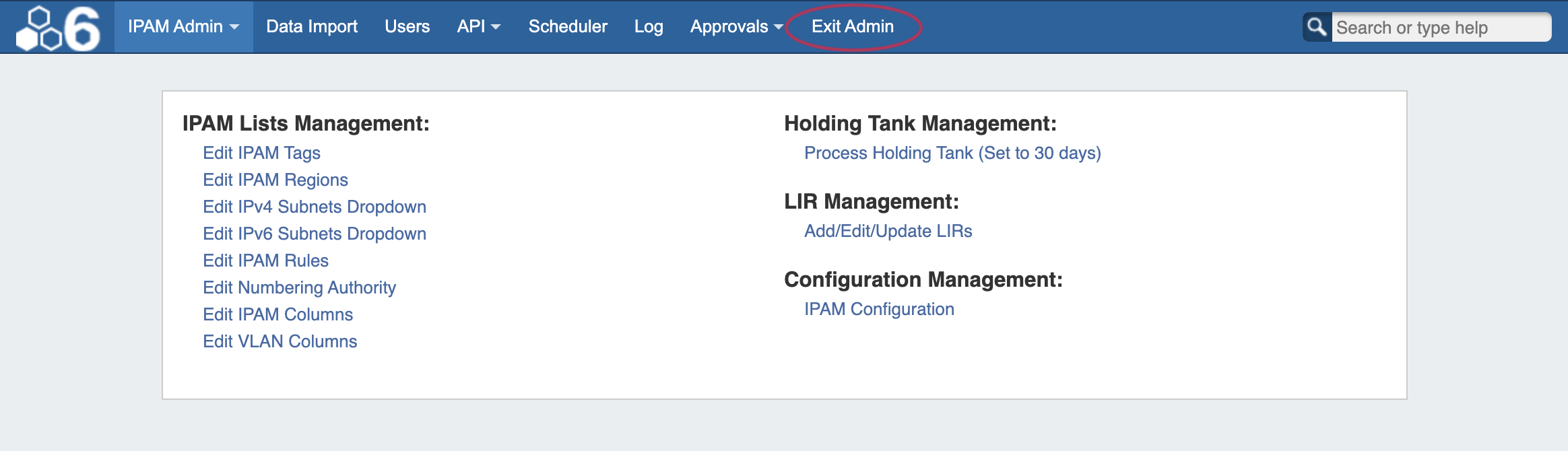 To leave the Admin area, simply click the "Exit Admin" link in the navigation bar. You will be redirected to the Dashboard.