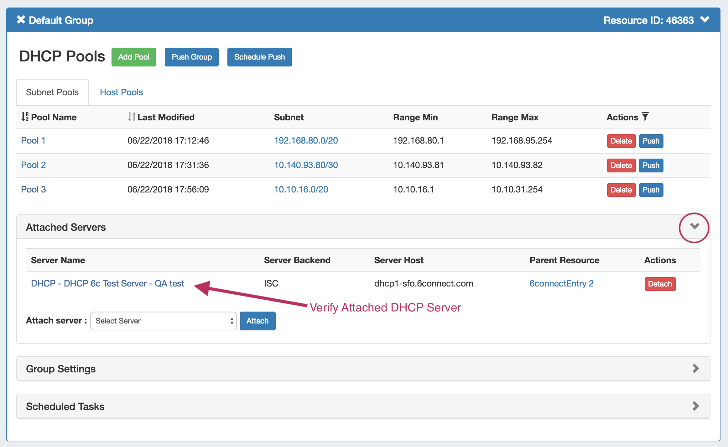 Before pushing a group, expand the "Attached Servers" section and verify that the correct server is attached to the DHCP Group.
