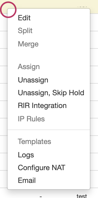 The Split option is not available for blocks that are already of the smallest available size ( IPv4 /32s or IPv6 /128s), for blocks in "Holding", or for blocks that are already assigned and do not have subassignments enabled. If more than one level of splitting is needed, use "Templates - Auto Split" instead.