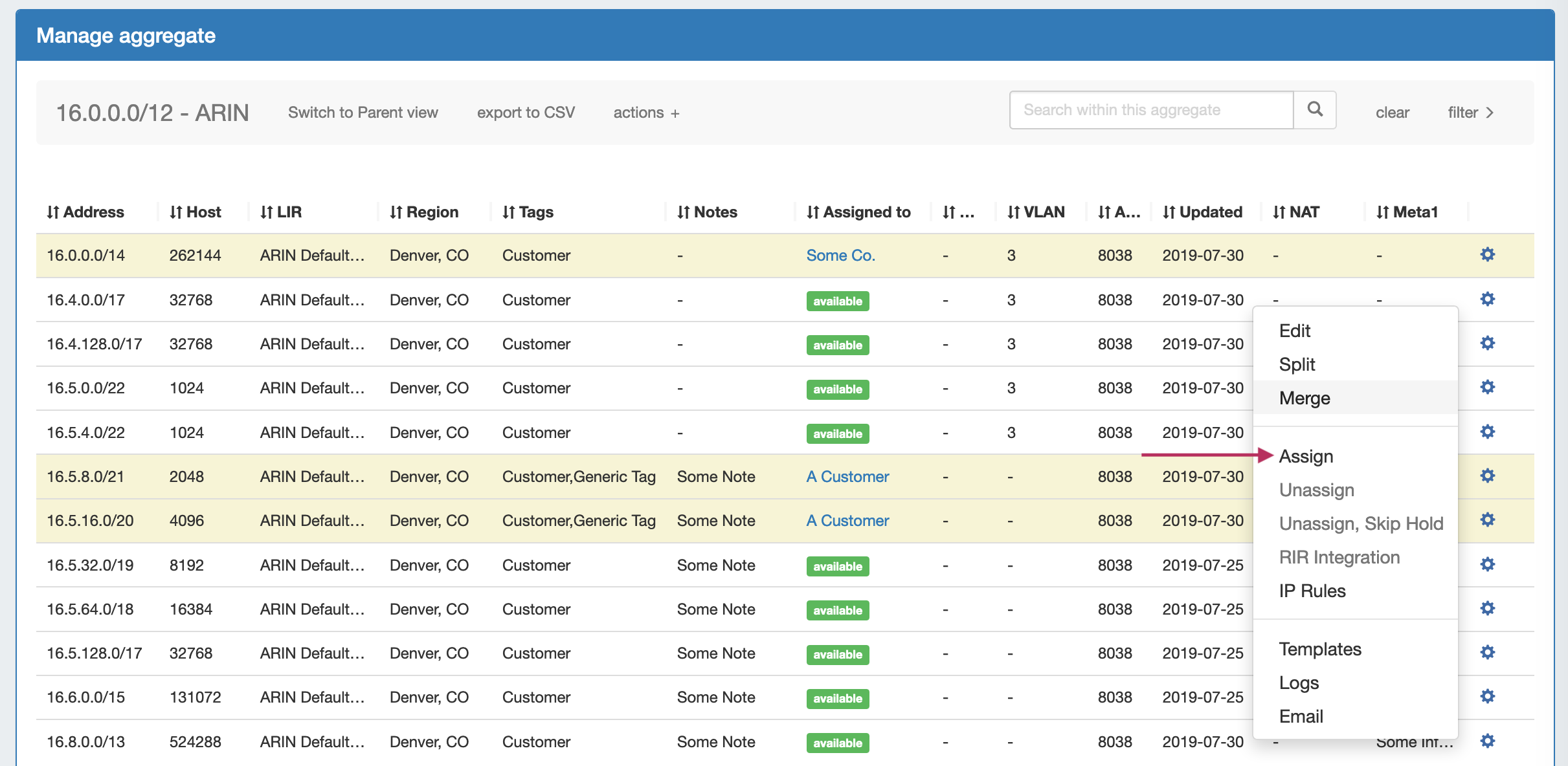 Merge: The opposite of Split. Merge combines two blocks of equal size into the next largest mask, e.g., two /25s will be merged into one /24. Merge is only available for adjacent blocks of the same size that are "Available", in "Holding", or is subassignable.