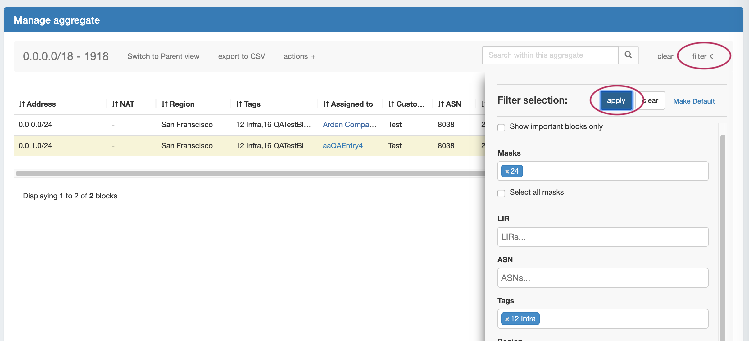 Filter the block list in IPAM Manage by toggling the "Filter +" link in the top right corner of the aggregate header.