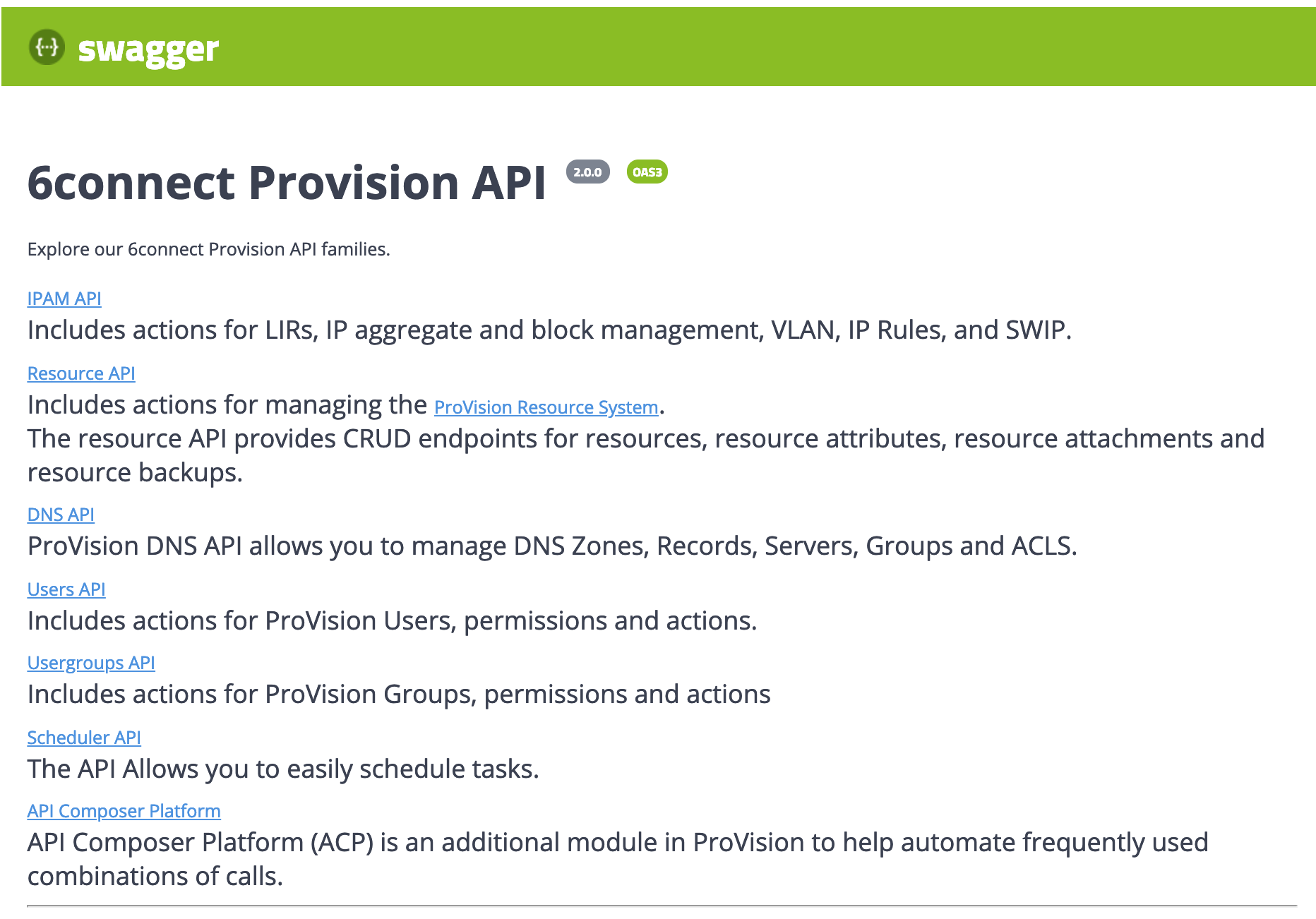 1. On the Provision API Swagger home page, click on the name link for the API family that you wish to browse (IPAM, Resource, DNS, etc).