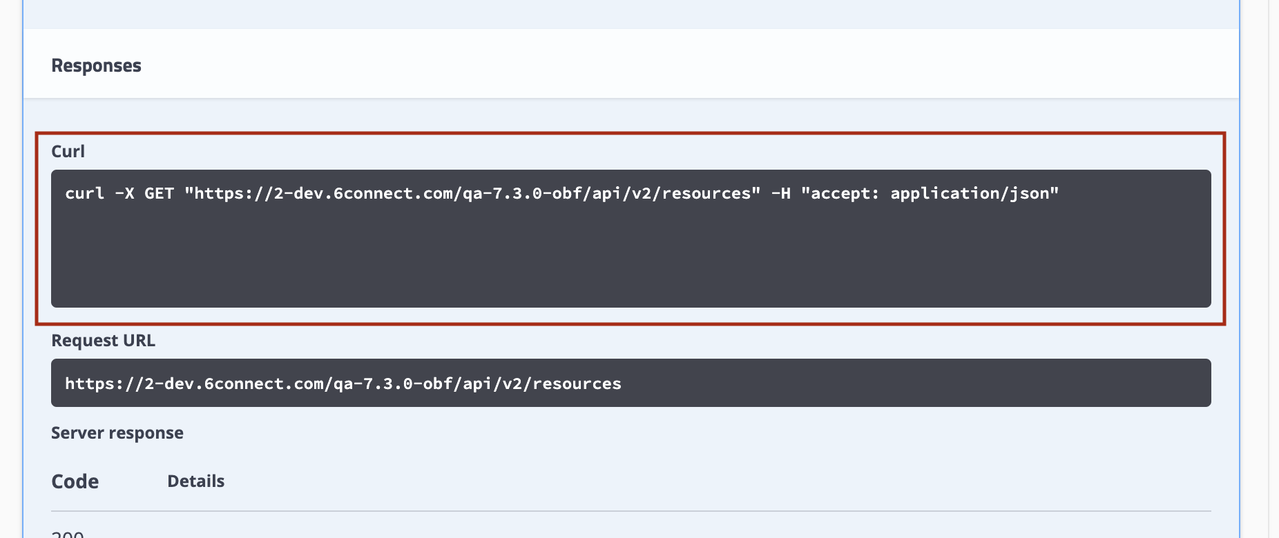 4. The example response will display under "Responses" after being executed. The "Response" section also includes the cURL command, Request URL, and Response Headers.