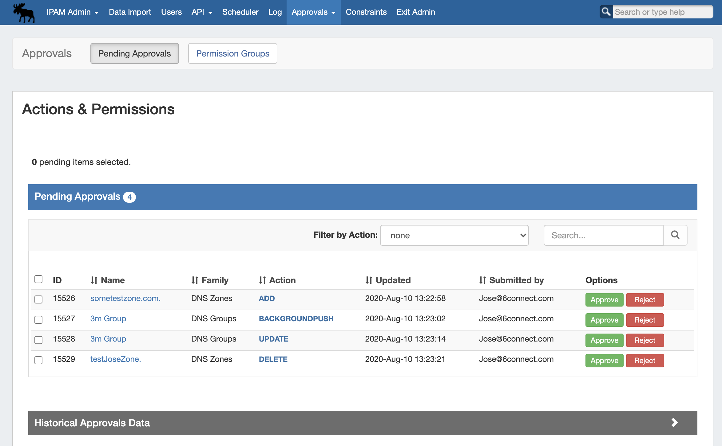 Currently, Approvals is available only for DNS related actions, while we gather feedback and use cases to inform possible future updates. If you are interested in providing feedback, a use case, or requests for future additions to the Approvals system, please contact feedback@6connect.com.