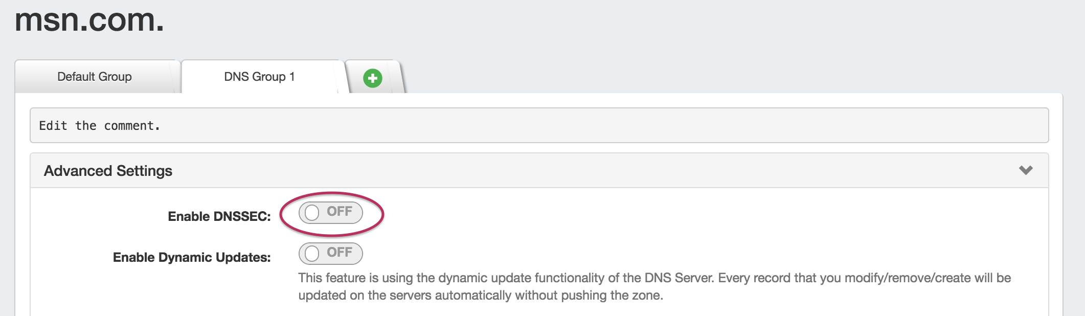 DNSSEC may be enabled on a per-zone basis in the ProVision Zone Advanced Settings.