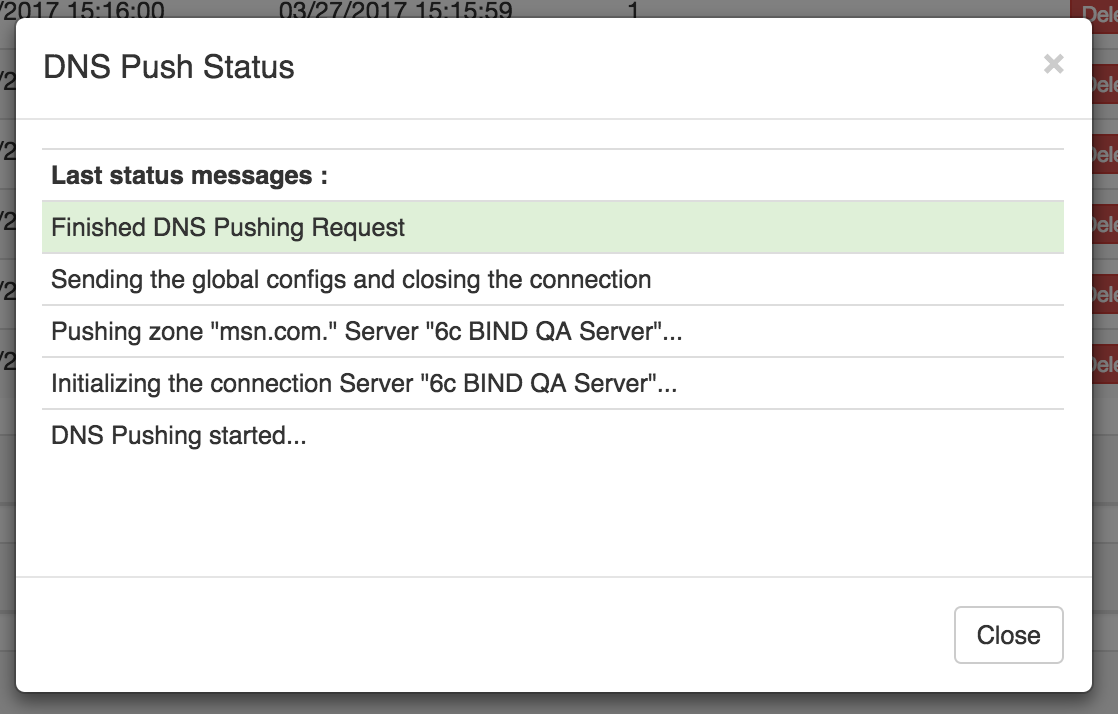 If successfully pushed, a green "Finished DNS Pushing Request" message will appear.