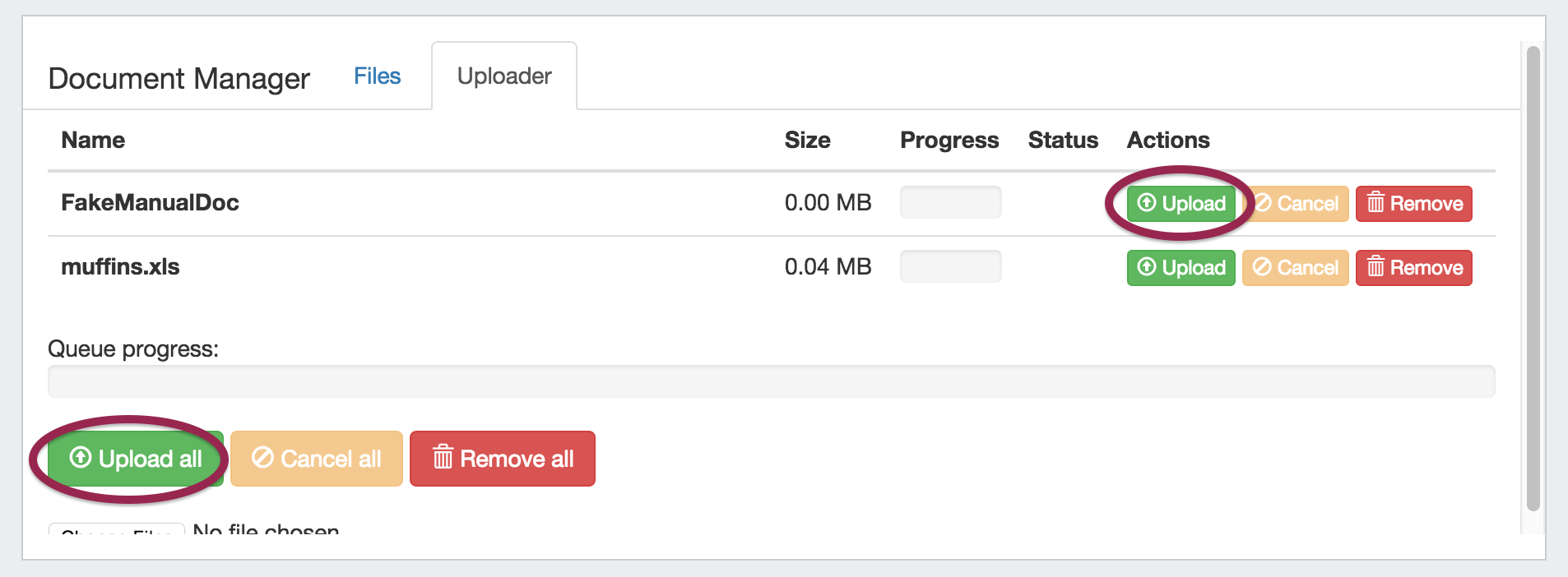 The selected files will show in a list under the Uploader tab. To upload the file(s), click on either the "Upload" button adjacent to the file to upload the individual file, or the "Upload All" button to upload all files listed. You may also choose to remove files from the upload list, or cancel.