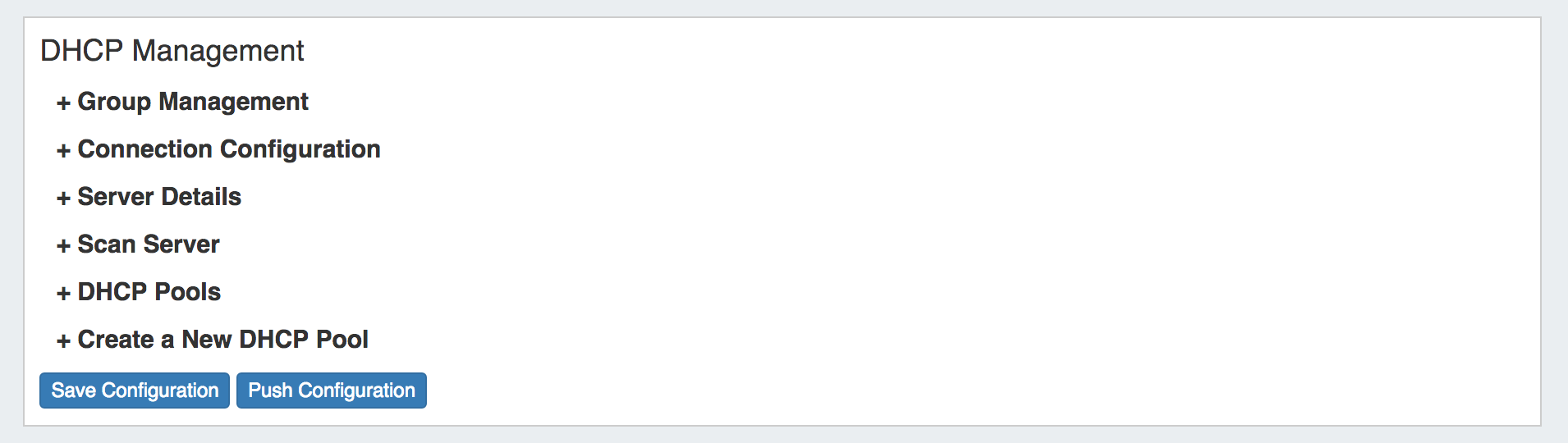 Each of the sections in the DHCP Management Gadget - Group Management, Connection Configuration, Server Details, Scan Server, DHCP Pools, and Create a New DHCP Pool - may be expanded to change settings in each area.
