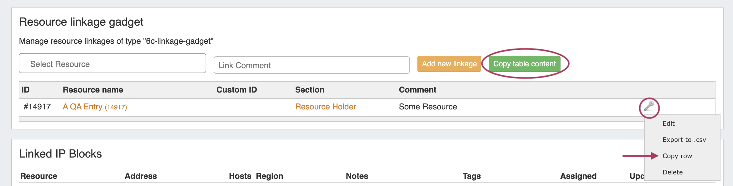 The Linked IPs Gadget lists IP blocks assigned to Resources linked under the Resource Linkage Gadget, with a link to the resource holder.