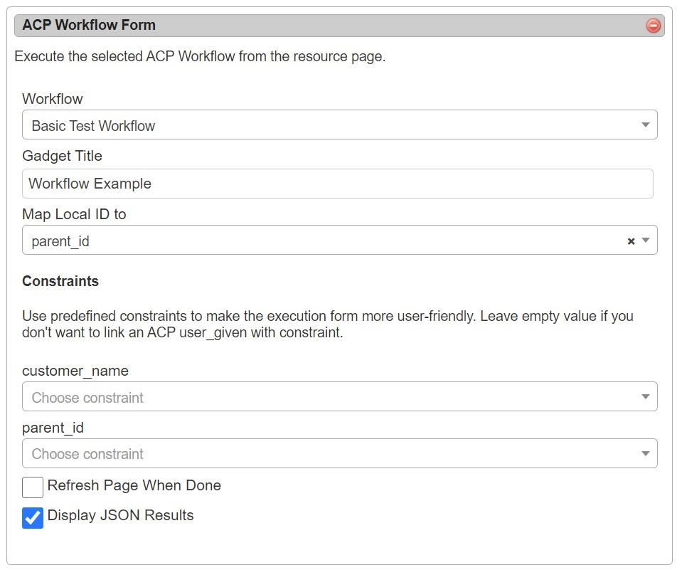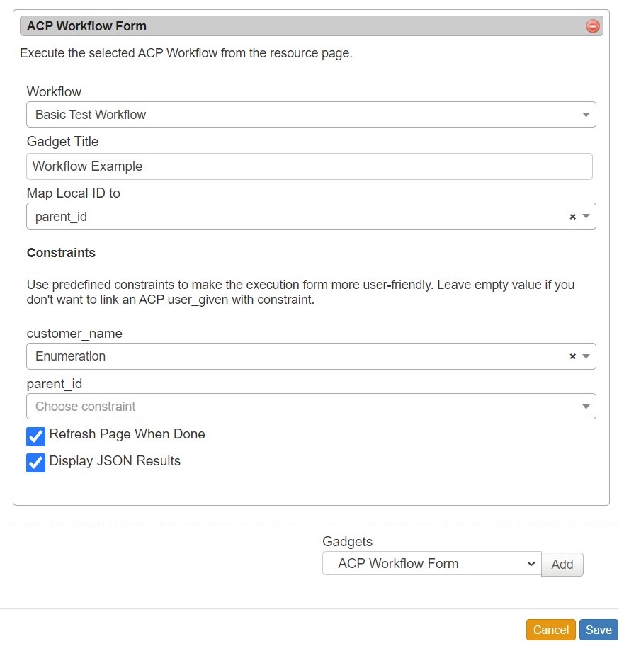 After setup, the ACP Workflows Gadget will load with the available Workflows from your ACP instance, and can be configured to select which Workflow and inputs you wish to use.