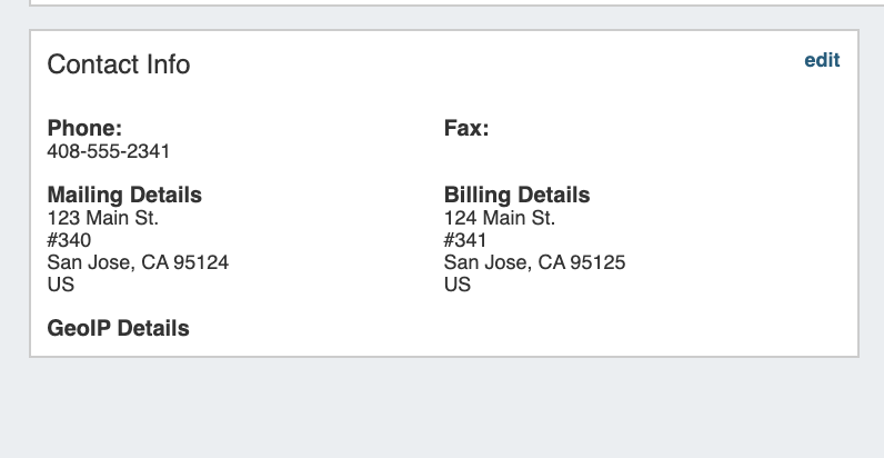 This Gadget is used on the Resource Holder Section type. In the Contact Info Gadget, you can track information such as mailing / billing addresses, phone number, and fax number for that Resource. You may also add a separate GEO IP address, if desired.