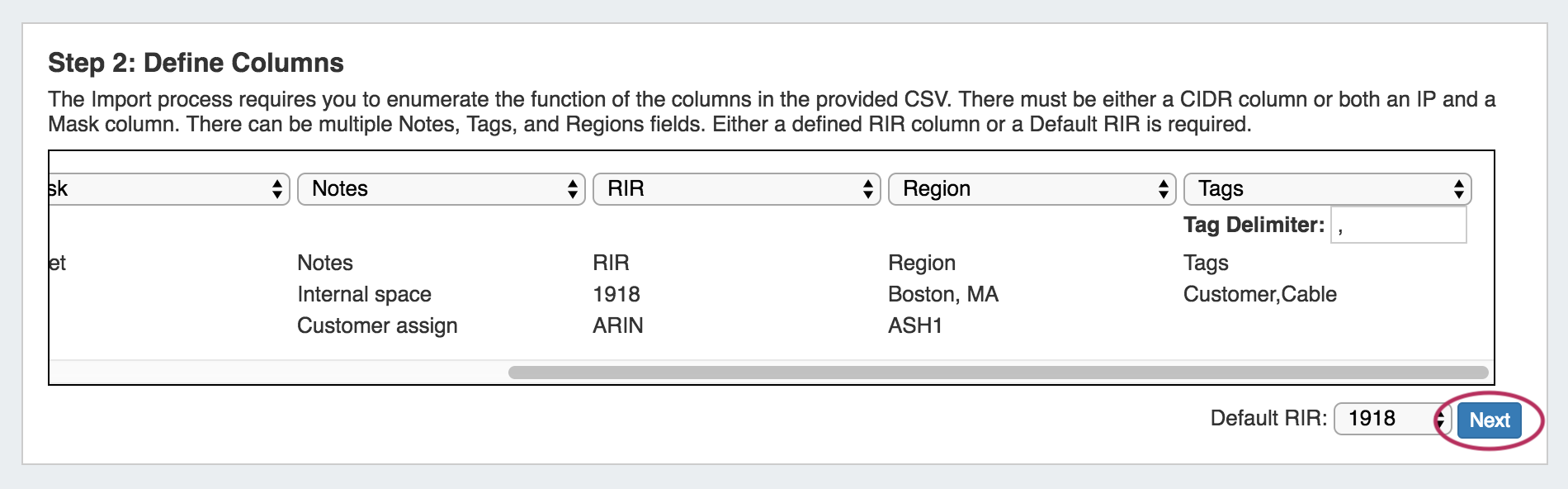 - If you do not have a defined RIR column, you must select a default RIR to associated the blocks to.