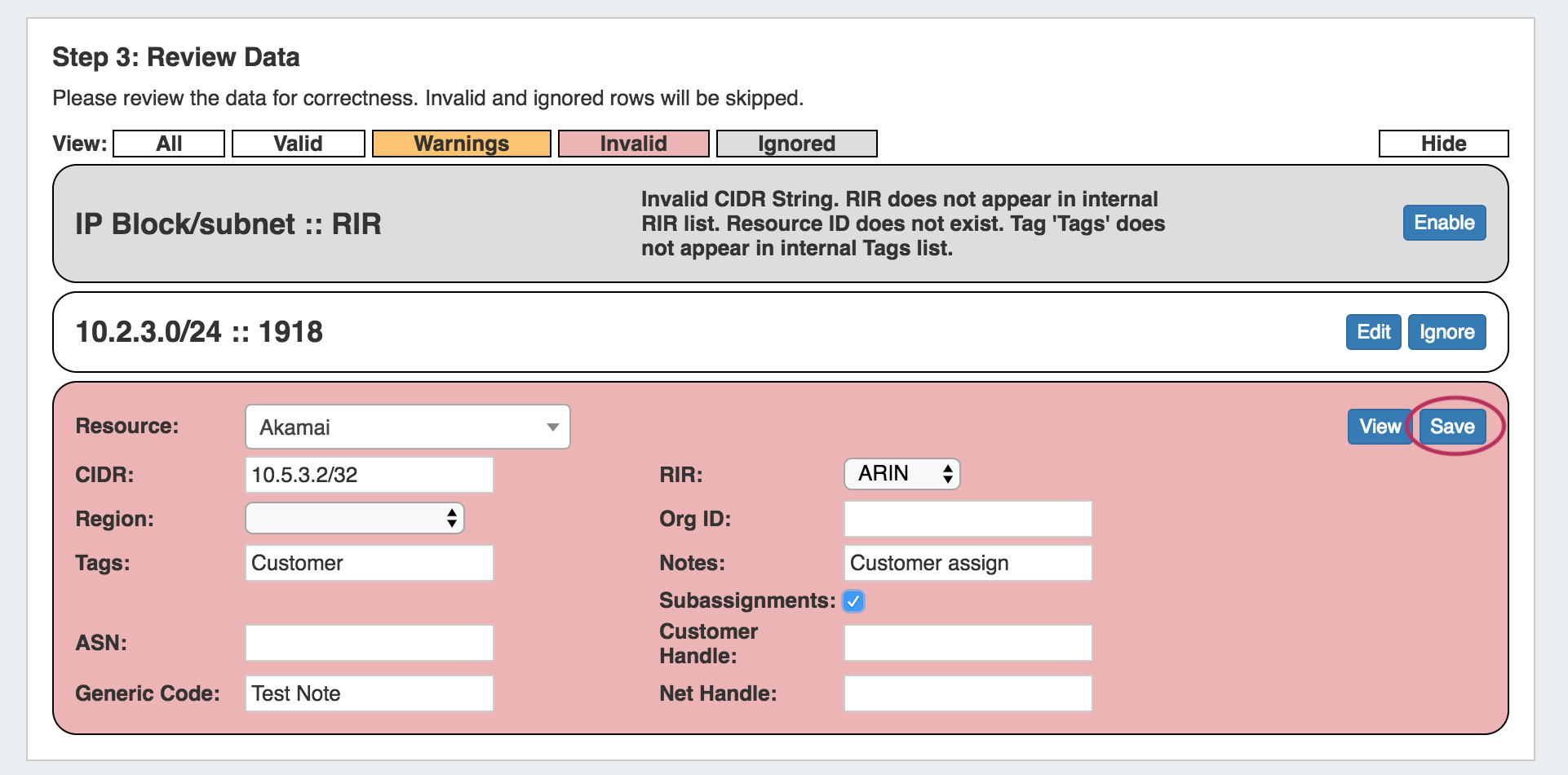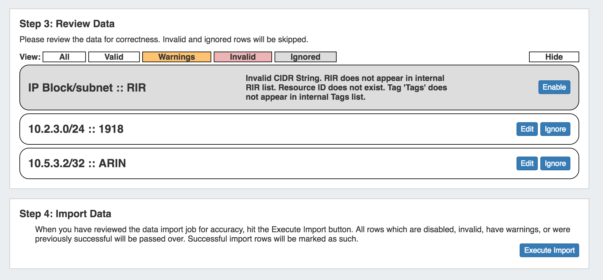 - If the IP Import was only partially successful or requires additional review, you may keep the import job in the "Existing Jobs" list and revise the failed / invalid blocks at a later time. Re-running the import from the same job will allow you to re-attempt import on only the previously unsuccessful / ignored / edited blocks - successfully imported and unchanged blocks will not be affected.